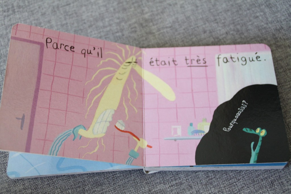 C’est l’histoire d’une petite grenouille qui n’a pas envie de dormir et qui demande pourquoi elle doit se coucher, pourquoi il fait nuit, pourquoi le soleil s’est couché… Et je vous laisserais découvrir la fin. Un petit format aux pages cartonnées, des dessins colorés, et une répétition dans le texte parfait pour les bébés… surtout si vous dites pourquôôââ avec une drôle de voix