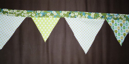 Quelques coupons de tissus, du biais, des ciseaux cranteurs et une heure plus tard on obtient une jolie guirlande de fanions.