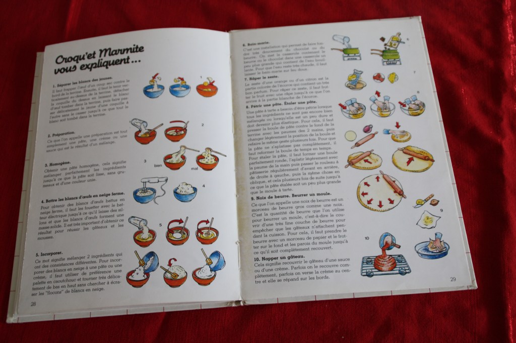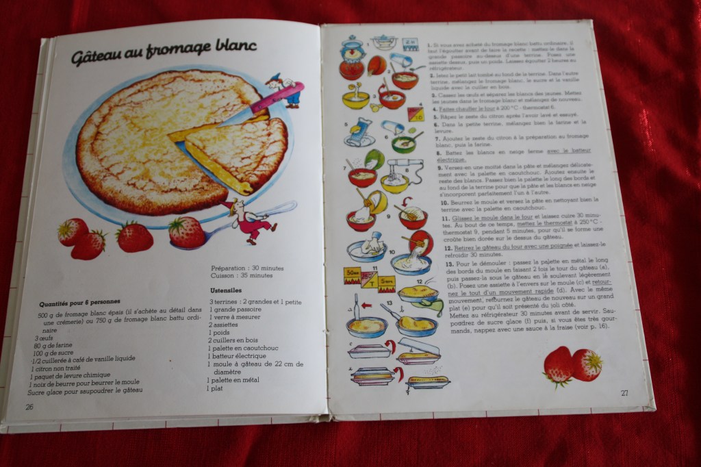 Ce que j’appécie dans ce livre, qui était à moi petite, c’est que toutes les étapes de la recette sont illustrées par des dessins. Le petit enfant peut facilement suivre la recette, le grand enfant peut la faire tout seul. Et les recettes ne se démodent pas. Quoique dans la recette du gâteau au fromage blanc, il est indiqué que le fromage blanc s’achète au détail dans une crémerie. Je cherche dans mon bottin et vous tiens au courant.