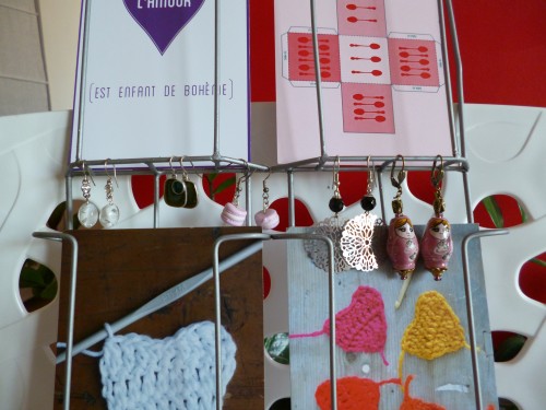 J’ai donc opté pour le porte cartes postales (ou photos) sur lesquels je fixe les dormeuses et les pendants. Pour les clous, je percerai de petits trous dans une des cartes postales. D’ailleurs, pour l’instant, j’ai affiché des cartes offertes dans la Thé Box, mais je compte bien les changer.