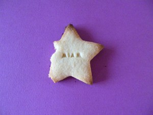 J’ai utilisé un emporte-pièce petit beurre personnalisable Brigitte Keks (http://www.fete-des-gateaux.com/boutique/emporte-pieces/130-emporte-piece-brigitte-petit-beurre-message.html). Enfin, juste la partie centrale où l’on met les lettres. Tu peux marquer tout ce que tu veux (ou presque) sur des sablés.