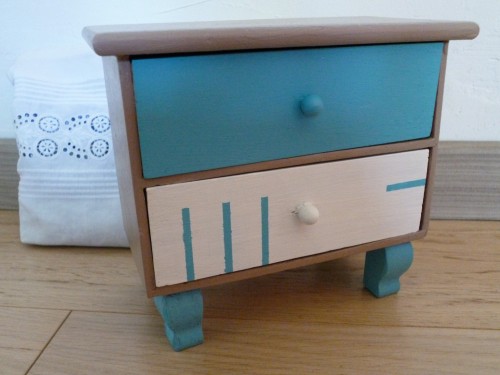 Après un léger ponçage, j’ai peint la mini commode et les tiroirs en taupe, blanc et bleu.