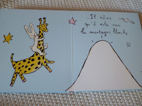 Lulu est confortablement installé dans son lit. Il dort. Et il fait un rêve qui l’entraine d’abord sur une girafe vers une montagne blanche. Là il rencontre un grand oiseau blanc et avec lui il vole vers un nuage rose et trois petits chatons. Trois petits chatons qui ont froid car il neige. Heureusement que Lulu est toujours bien au chaud dans son lit car il neige sur sa maison.