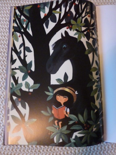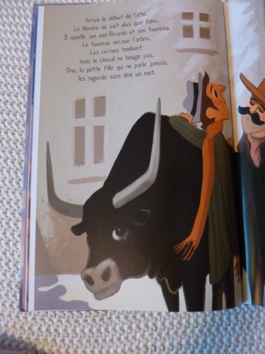 Il y a beaucoup de poésie dans ce livre qui parle d’un cheval perché dans un arbre sur une place dans un petit village de Catalogne à côté d’une librairie. Le libraire et Ona une petite fille qui ne parle jamais passent chaque jour devant le cerisier et le cheval, le saluent et se demandent pourquoi il est là.