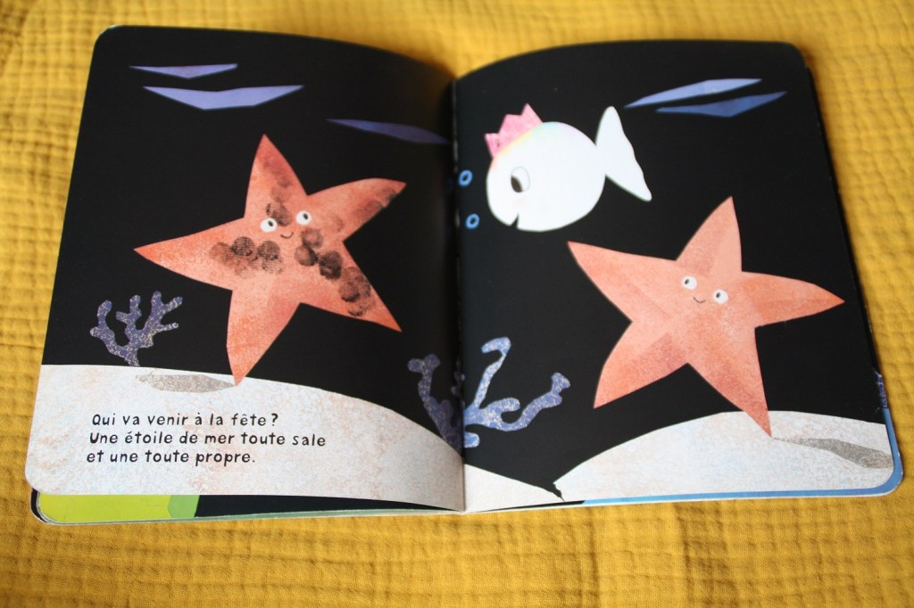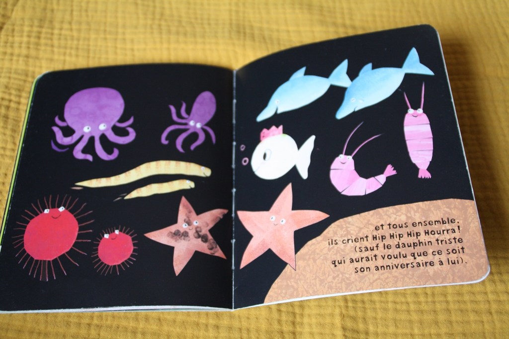 Et l’histoire ? Petit poisson blanc fête a deux ans et tous ses amis de la mer viennent fêter son anniversaire.