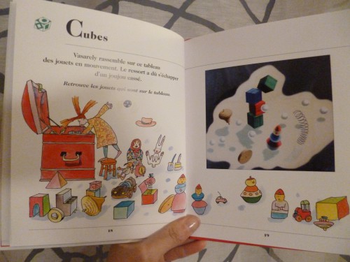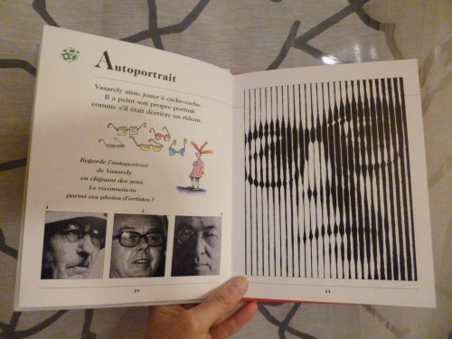 Vasarely vous a à l’oeil de Sylvie Girardet et Nestor Salas dans la collection Salut l’artiste des éditions Le musée en herbe. C’est un livre jeu qui présente sur chaque double-page une oeuvre d’un artiste (ici donc, Vasarely) et un jeu comme trouver les différences, reconnaître une partie d’un tableau, recolorer une oeuvre.