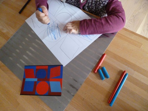 L’activité donc (après une pause goûter). Nous avons exercé nos talents de copiste. Moi, au dessin, ma fille au coloriage.