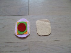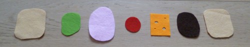 Pour un sandwich pain de mie, steak haché ou jambon, fromage, salade et tomate, il faut de la feutrine beige, rose, marron, orange, verte, rouge et une paire de ciseaux.