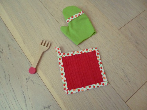 Pour le carré, j’ai coupé un carré de tissu de 10 cm, j’ai cousu le biais autour en ajoutant une boucle pour pouvoir attacher la manique à la mini-cuisinière.