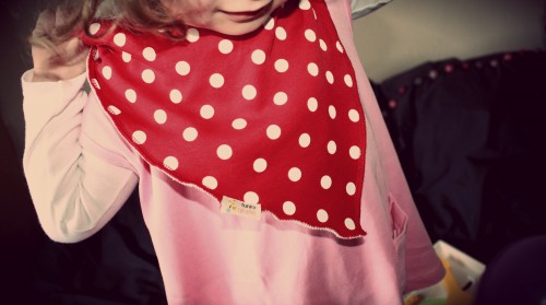 Ma fille a grandi. Elle a abandonné lit à barreaux, couche (la journée) et chaise haute. Mais elle avait toujours ses bavoirs de bébé, les mêmes depuis le début de la diversification. Or, pas question de manger avec une simple serviette sur les genoux, au risque de devoir changer de vêtements à chaque repas.