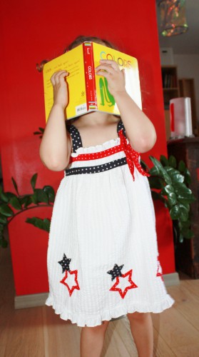 L’occasion pour moi de vous montrer un look très Independance Day.Même s’il n’est pas facile de photographier une étoile filante, voici un cliché de cette robe achetée aux Etats-Unis et qui malgré l’étiquette 2 years pourra être encore portée l’été prochain (j’ai dû raccourcir les bretelles de plusieurs centimètres).