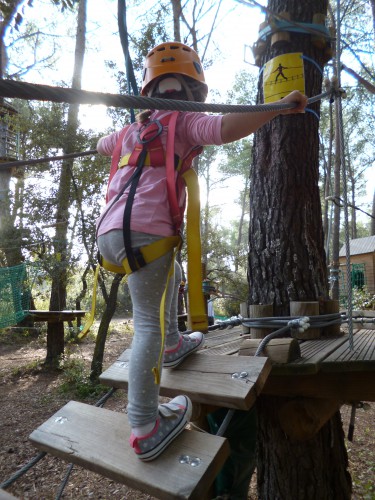 Alors qu’elle adore ce genre de parcours (filet, poutre…) dans les parcs d’attraction ; cette fois-ci avec l’attirail et le fait d’être attachée à un câble, elle n’a pas été emballée.