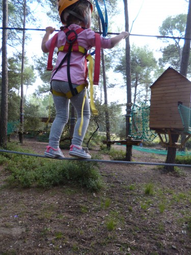 Pour les 2 à 6 ans, il existe cinq parcours à environ 1m ou 1m50 de hauteur, alternant tyrolienne, pont, filet, câble, cabane… Une fois le casque et le harnais mis, on peut débuter le parcours.