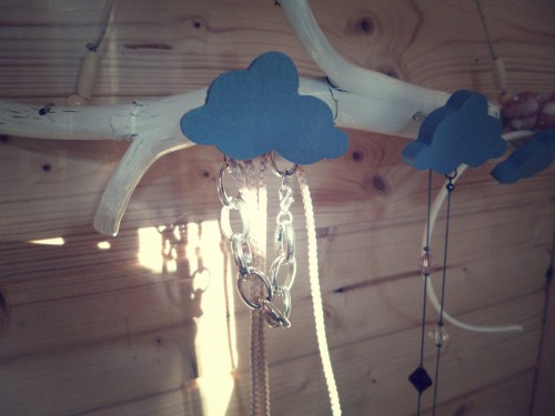 C’est l’histoire d’une branche qui devait devenir un mobile. Mise de côté depuis quelques temps (ça se compte en années), j’ai voulu la transformer en porte-bijoux.
