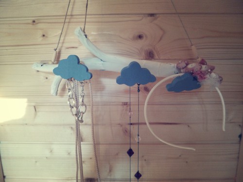 C’est l’histoire d’une branche qui devait devenir un mobile. Mise de côté depuis quelques temps (ça se compte en années), j’ai voulu la transformer en porte-bijoux.