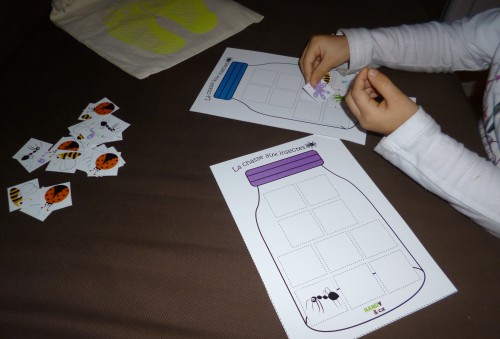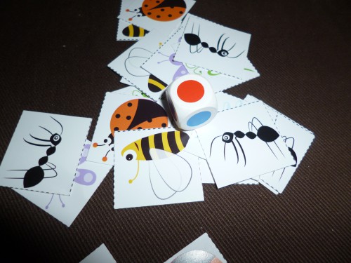 Un jeu à faire en famille. Après du découpage (activité pour maman), nous avons joué tous les trois à essayer de remplir le plus rapidement possible notre bocal d’insectes avec le dé de couleurs (pour déterminer quel insecte ajouté ou enlevé) et le dé + -. Comme le jeu durait un peu trop longtemps, nous avons suivi l’astuce du livret et continué de jouer avec le dé de couleurs uniquement. Et quand le jeu est terminé, hop, on range tout dans la pochette en tissu fournie.