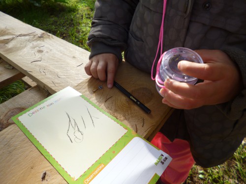 Partons dans le jardin observer les insectes. C’est moi qui ait du attraper une araignée et une fourmi pour les mettre dans la boîte loupe. Et ce n’est pas évident, ces insectes ne se laisse pas vraiment faire. Ma fille m’a parlé de mouche… je n’ai pas tenté d’en capturer une. Bref, elle a pu observer grâce à la loupe l’araignée et la dessiner (il y a presque le bon nombre de pattes). Nous n’avons pas lu toutes les explications sur les insectes, mais nous pourrons toujours le faire quand elle sera un peu plus grande.