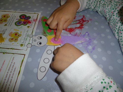 Une libellule en carton avec des parties autocollantes à découvrir progressivement, des sachets de sables colorés. Voici une première pour ma fille qui a bien aimé colorer cet insecte. Et comme il nous reste du sable, elle pourra encore jouer avec, il suffira d’une feuille et d’un tube de colle.