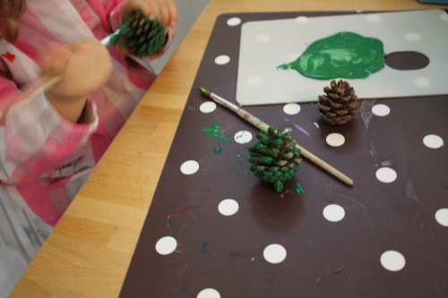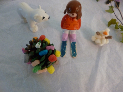 Et pour finir cette belle journée à la montagne, les Playmobils (aidés par ma fille) ont décoré un sapin de Noël (une pomme de pin peinte en vert) avec de jolies boules colorées (toujours des playmais).