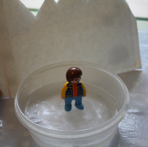 Pour la partie de boule de neige, j’aurais voulu faire ça en vrai (en miniature bien sûr), mais il n’y avait pas le moindre givre dans mon congélateur. Quelques playmais blancs ont donc fait l’affaire.