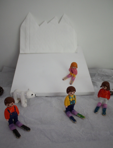 Je crois bien que les personnages se sont amusés… et ma fille a adoré décorer les mini sapins et faire descendre les Playmobils sur la pente enneigée (une toile vierge sur châssis).
