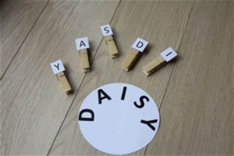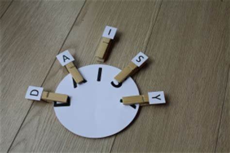 Sur un cercle de carton, il faut écrire ou imprimer le prénom. Puis il faut coller sur des épingles à linge les lettres individuellement. Il n’y a plus qu’à épingler les lettres correctement sur le modèle.