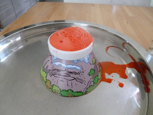 Le mélange rouge est donc versé dans le gobelet du volcan. Et… pas d’éruption.