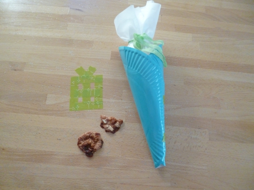 Vous coupez environ 60 cm de papier sulfurisé. Vous le plier en deux et replier les côtés. Vous glisssez le papier sulfurisé dans le cornet, le remplissez avec les friandises et refermer avec un morceau de ruban. Vous pouvez aussi accrocher au ruban une jolie carte de voeux.