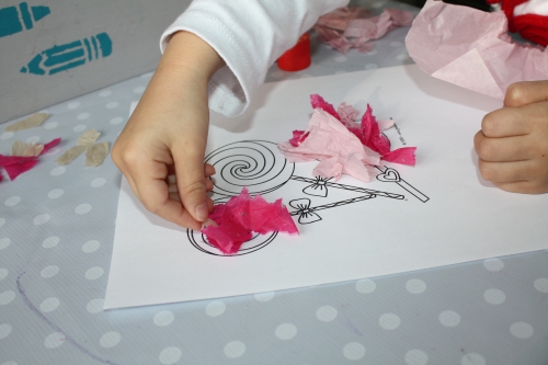 Parmi tous les matériaux utilisés (j’ai beaucoup recyclé !), elle a adoré le papier de soie : déchirer des petits morceaux pour les coller ensuite.