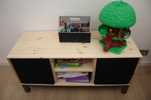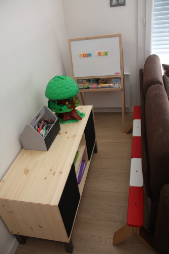 Nous avions, au départ, une petite caisse de jouets et un tableau. Mais la caisse ne pouvait plus tout contenir. Les feuilles de papier étaient stockées sur la table basse. Alors ce week-end, nous avons aménagé un vrai coin pour elle dans le salon : un espace inutilisé derrière un canapé avec son tableau blanc et un meuble pour ranger ses jouets dans deux paniers et deux étagères pour les y mettre tout le nécessaire à dessin. Il y a même une petite poutre qui, quand elle n’est pas dans le jardin, sert de banc.
