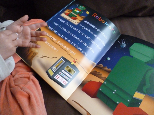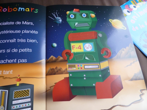 Nous avons eu la chance de recevoir, juste avant les vacances, l’un des derniers livres autocollants des éditions Fleurus : les robots. Ma fille s’était déjà amusée, plus petite, avec cette collection comme les animaux de la ferme et les animaux familiers. A partir d’une base d’animaux, il fallait y coller les yeux, les oreilles, les pattes… Cela donnait parfois de drôles de bestioles. Mais là, elle s’est appliquée. Elle m’a demandé quelques autocollants devaient être utilisés pour chaque page et a suivi le modèle. Et comme les autocollants sont repositionnables, elle peut se tromper et recommencer… ou même inventer de nouveaux robots.