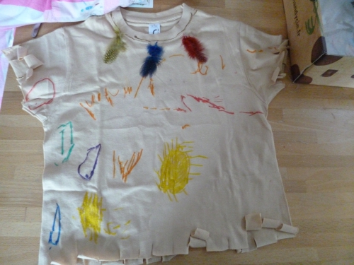 - Demandez à votre enfant de découper des franches sur le bas du T-shirt et au niveau des manches