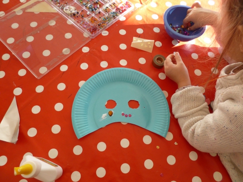 Ensuite, j’ai mis à disposition de ma fille des sequins et des pierres faussement précieuses pour qu’elle les colle selon son inspiration sur le masque. Comme elle est assez patiente pour ce genre d’activité, elle en a collé sur tout le masque. Même si elle était parfois embêtée par un sequin qui restait collé sur le doigt.