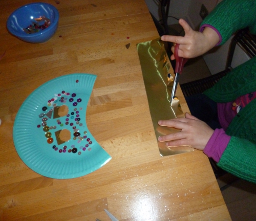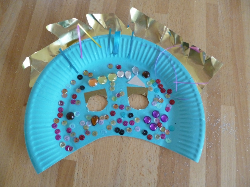1. Pour ce rendez-vous « Il faut que ça brille ! » j’avais hésité avec un masque à paillettes mais je n’avais plus de paillettes. Pourtant, les paillettes font souvent fureur auprès des petites filles. Tant pis, ce sera pour une prochaine fois.