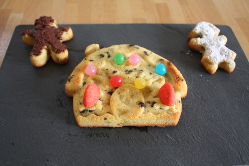 Faites préchauffer le four à 180°C (thermostat 6). Pelez et coupez les bananes en rondelles (à recouper en quatre pour le moule de Grand-mère, Grand-père et leur maison). Faites fondre le beurre. Séparez les blancs des jaunes d’oeufs. Dans un récipient, mélangez les jaunes d’oeufs et le sucre. Ajoutez le beurre fondu et la farine. Battez les blancs en neige. Incorporez-les délicatement à la préparation. Ajoutez les bananes et les pépites de chocolat. Versez dans le moule et faites cuire 40 minutes pour toute la préparation dans un moule classique, mais uniquement 30 minutes dans le moule que j’ai utilisé.