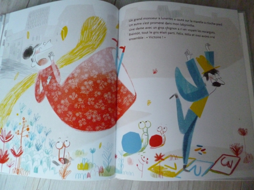 J’ai beaucoup aimé les illustrations qui prennent peu à peu des couleurs et deviennent plus enfantines ; et cette histoire joyeuse qui, finalement, dit qu’il en faut peu (quelques dessins) pour être heureux.