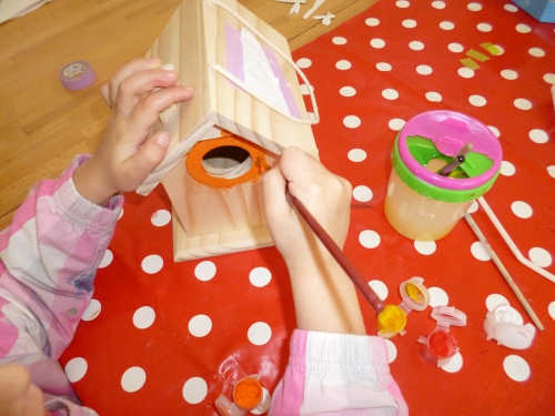 Elle a bien aimé décorer cette cabane à oiseaux, que l’on a installée (remplie de graines) près de sa cabane de jardin. C’est juste dommage que la peinture ait un peu bavé en appliquant le vernis.