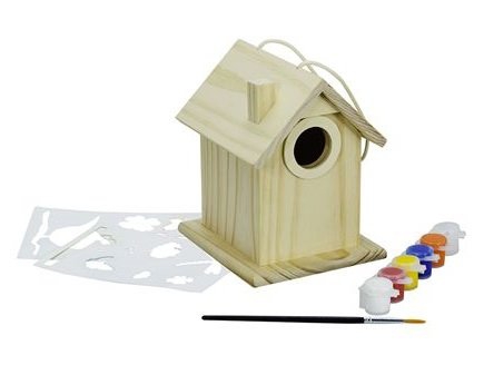 C’est un kit qu’elle a eu en cadeau pour ses trois ans : le nichoir à oiseaux à décorer de Jardikid. Il comprend un abri en bois, des pochoirs en carton, un pinceau, de la peinture et du vernis transparent.