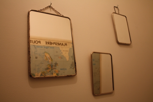 Ces trois miroirs de barbiers se tiennent compagnie sur le mur d’en face.
