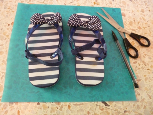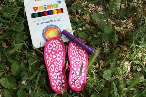 Ma deuxième idée a été de faire des repères à l’intérieur des chaussures, immédiatement visibles lorsqu’on tente d’enfiler les chaussures. Il existe des autocollants en deux parties à coller sur la semelle intérieure, mais après avoir testé des autocollants avec le nom de l’enfant qui finissaient par se décoller, je me suis dit que j’allais me débrouiller sans autocollant. J’ai donc dessiné avec des marqueurs pour tissu (pour une semelle en tissu bien sûr) un papillon. L’aile gauche dans la chaussure gauche et l’aile droite dans la chaussure droite, il suffit de reconstituer le dessin pour mettre les chaussures dans le bon sens.