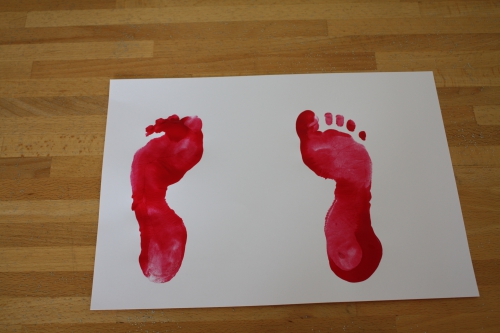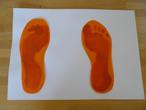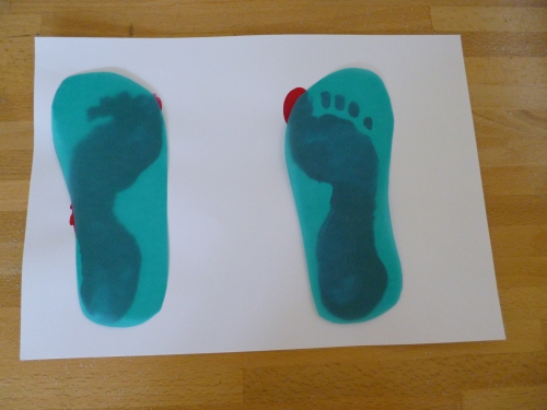 Ma troisième idée a été de faire un petit jeu autour des pieds et des chaussures. Ma fille a fait l’empreinte de ses pieds avec de la peinture. Cela permet déjà de lui montrer que ses pieds ne sont pas symétriques. Ensuite, j’ai dessiné et découpé la forme de ses chaussures dans du papier calque coloré. Et elle a joué à remettre les « chaussures » aux bons pieds. Avec ce jeu, on voit bien qu’avec des chaussures à l’envers, il a toujours un bout d’orteil qui dépasse du calque… et donc un petit pied qui va devoir se tordre.