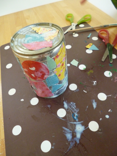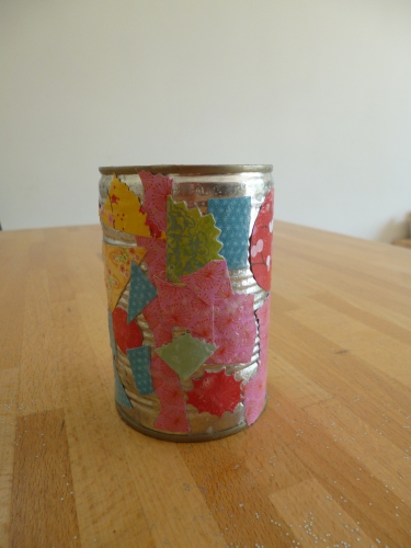 Très simple, nous avons découpé (beaucoup elle, un peu moi) des papiers colorés et à motifs, puis elle les a collé sur la boite de conserve avec du vernis colle. Pour les prochaines boites, il y aura forcément de la peinture, mais je cherche d’autres idées.
