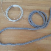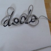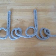 Pour estimer la longueur du cordon de tricotin, j’ai écrit le mot en manuscrit et mesuré avec un morceau de laine. J’ai préparé le cordon de tricotin avec de la laine grise et ensuite inséré le fil d’aluminium. Une fois le mot formé, j’ai fignolé en maintenant les lettres (notamment l’aller-retour de la barre du d) avec un petit morceau de laine noué.