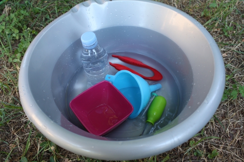 Quand les températures dépassent facilement les 30°C et que les cigales chantent, on se rafraichit comme on peut. Une bassine d’eau et quelques accessoires pour jouer avec l’eau : remplir, verser, transvaser…