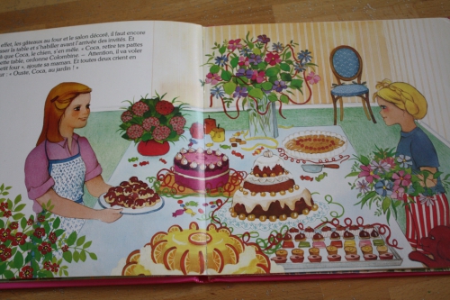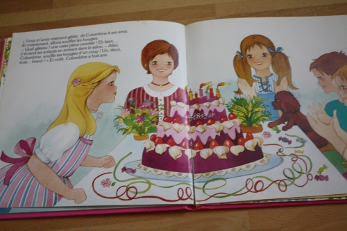 C’est l’histoire de Colombine qui fête ses 8 ans avec ses amis. Et sa maman lui a préparé un superbe anniversaire et une surprise. Oui, vous qui passez du temps à organiser le goûter d’anniversaire dans les moindres détails, vous n’arrivez pas au niveau de la maman de Colombine qui a préparé cinq gâteaux dont une pièce montée (ça fait beaucoup pour une dizaine d’enfants ! ) et surtout qui a loué pour sa fille et tous les invités de splendides déguisements (on peut même utiliser le terme « costumes d’époque ») de princesses et princes de la Renaissance. Et là, vous comprenez sûrement pourquoi j’aimais ce livre. D’abord j’aimais beaucoup la coiffure de Colombine, mais ça c’est la partie la plus facile à reproduire ; et surtout j’aurais bien aimé porter une robe de princesse comme celles du livre. Bah, si un jour je vais au bal de Versailles…