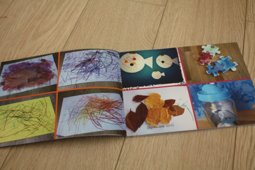 J’ai voulu tout de même garder un souvenir de toutes ses oeuvres d’art. Je les ai toutes photographiées. De sa première peinture à 10 mois, son premier bonhomme, son première cadeau de fête des pères, à ses peintures de l’école. Et je les ai publiées dans un livre photo : le premier cahier de ses oeuvres d’art.