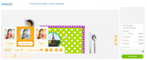 Pour choisir l’objet à personnaliser, il faut choisir la catégorie « cadeaux photos ». Mais vous avez le droit d’être égoïste (comme moi) et de le garder pour vous ! Vous avez ensuite le choix entre plusieurs fonds, motifs, mais vous pouvez aussi décider de faire imprimer votre photo sur l’intégralité du set (on en reparle bientôt). Ensuite, il reste à télécharger la photo, la repositionner si nécessaire dans le cadre, et décider entre le mode couleur, sépia ou noir et blanc. Et enfin d’attendre (mais pas trop longtemps) votre colis.