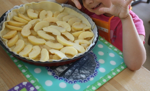 Et rien de mieux pour tester ces nouveaux sets de tables bordés de pommes, que de faire une tarte aux pommes à quatre mains.