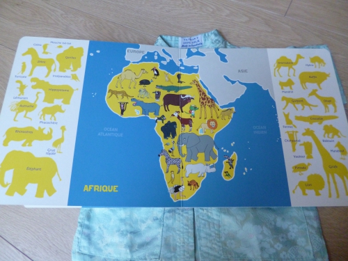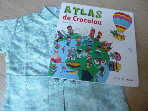 J’ai donc trouvé ce livre aux pages cartonnées qui présente les différents continents du monde à travers l’histoire du tour du monde de Crocolou. Pour chaque continent, il y a une double page avec une carte des pays et le récit de la découverte de ces pays par Crocolou (personnage mi-loup, mi-crocodile que ma fille aime beaucoup pour avoir lu d’autres histoires dont il est le héros).