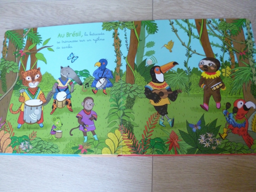 C’est une nouveauté, un livre sonore pour découvrir des musiques et des instruments traditionnels de quatre continents. Chaque double page nous amène dans un pays ou un continent différent : Etats-Unis, Brésil, Chine, Inde, Russie, Afrique. L’illustration colorée montre des animaux en train de jouer des instruments de la région en question et il y a deux puces par page pour déclencher la musique.